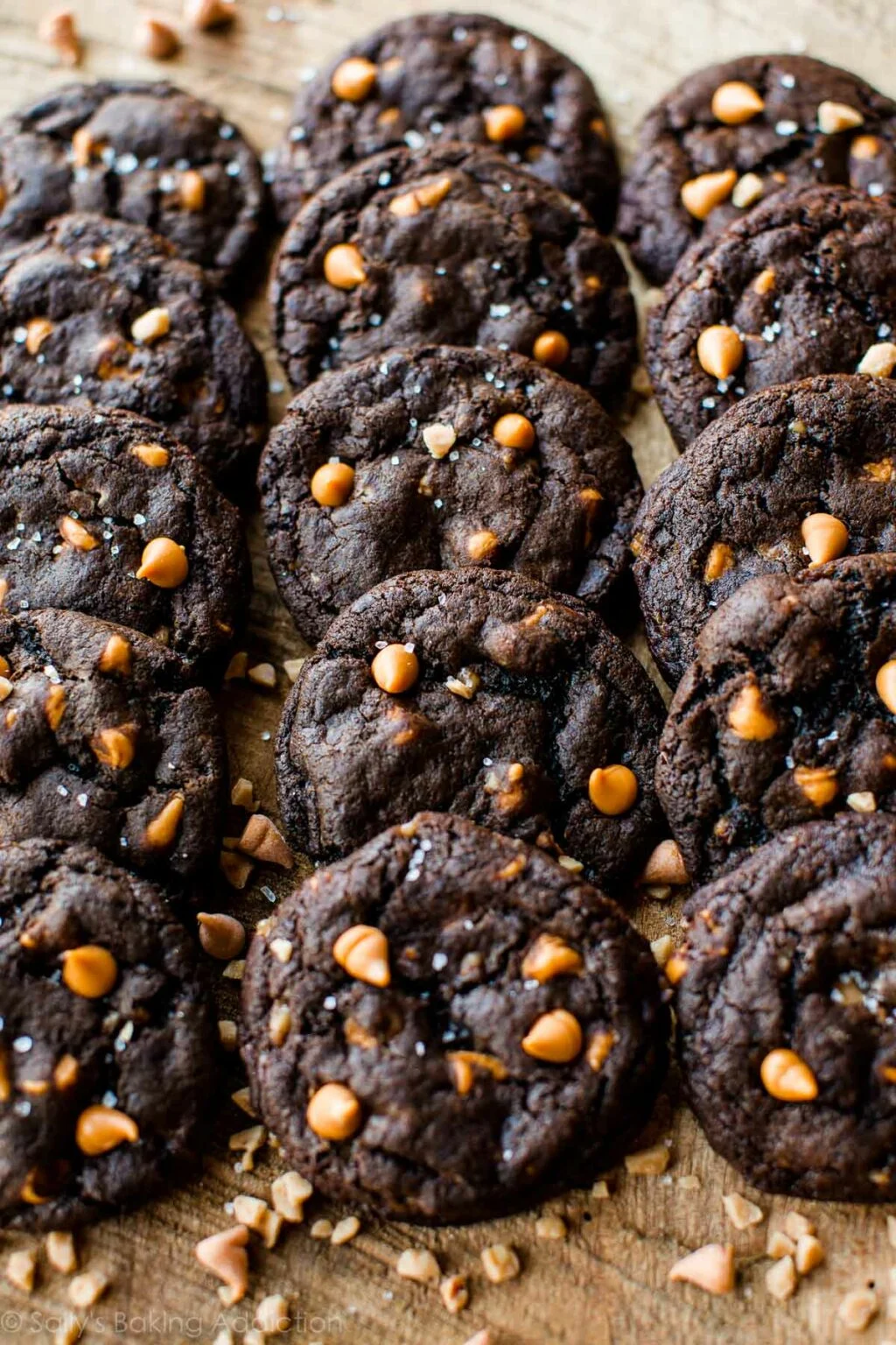 These super soft baked fudge cookies are filled with butterscotch and sweet salty toffee bits. Top with sea salt to make a totally irresistible chocolate cookie!