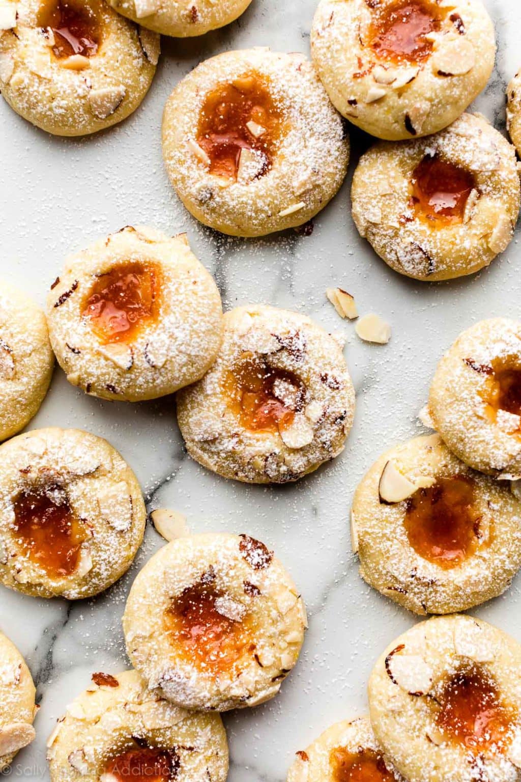 These thumbprint-style apricot cream cheese cookies include cream cheese in the dough, so they’re extra tender and soft. They’re flavored with almond extract and refreshing lemon zest, rolled in sliced almonds for a little crunch, and filled with apricot jam or preserves. Strawberry, peach, or raspberry are also delicious!