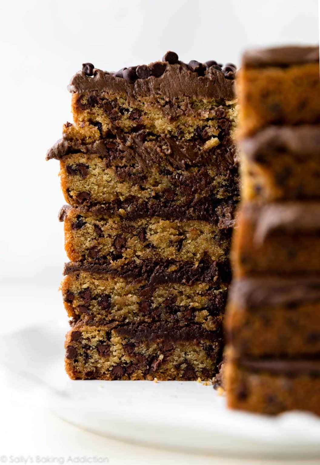 This chocolate chip cookie layer cake is a chocolate chip cookie skyscraper. Prepared with homemade chocolate chip cookie dough, each thick layer is soft-baked and deliciously chewy. Sprinkled with mini chocolate chips and topped with chocolate peanut butter frosting, this indulgent dessert is certainly a showstopper.