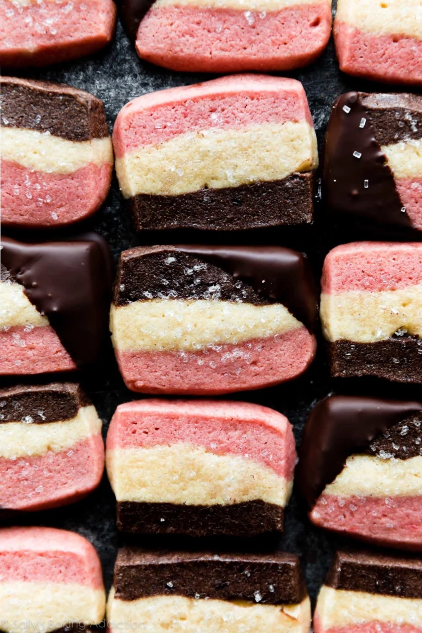 Neapolitan cookies are soft butter cookies flavored with chocolate, vanilla, and strawberry. They’re shaped in a loaf pan and made from just 1 cookie dough. So pretty!