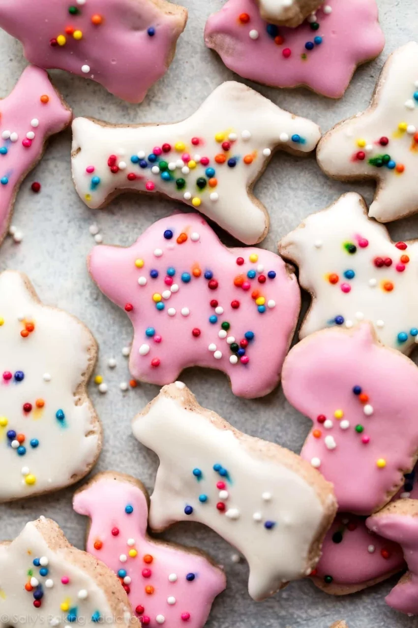 Turn a simple 8 ingredient sugar cookie recipe into homemade mini animal cracker cookies. Using my favorite sugar cookies as the base, these kid-friendly cookies are flavored with delicious cinnamon and topped with icing and rainbow sprinkles. Young bakers always love to help with these adorable cookies!