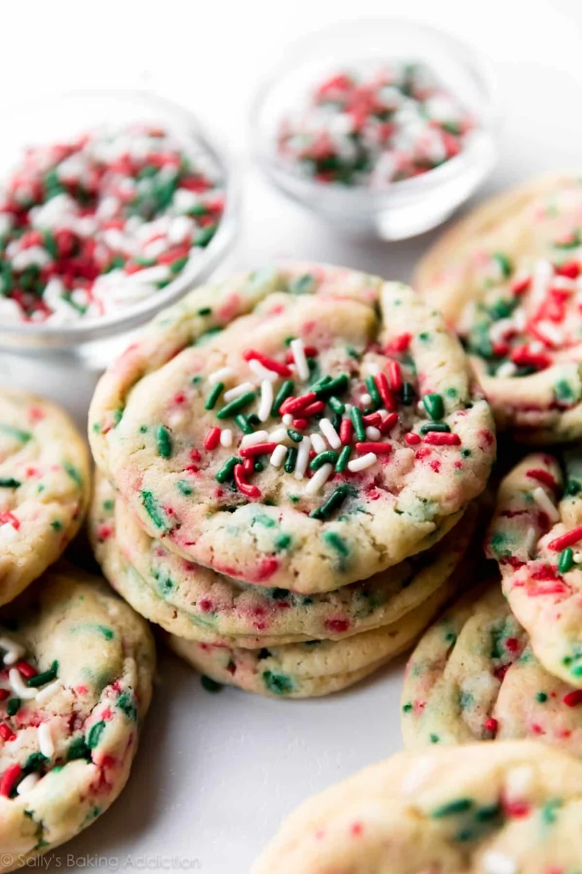These soft, chewy, and sprinkle loaded drop style Christmas sugar cookies are made with only 8 ingredients. No rolling pin or cookie cutters required!