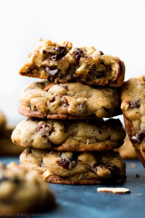 These dark chocolate cranberry almond cookies are massively thick, buttery soft, spiced with cinnamon, and loaded with cranberries, almonds, and pools of melted dark chocolate.