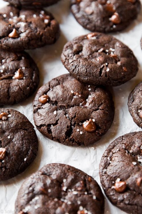 Made with 2 types of cocoa powder for an intensely deep chocolate flavor, these salted dark chocolate cookies feature crisp edges and soft chewy centers just like chewy fudgy frosted brownies. A sprinkle of sea salt is the perfect finishing touch on each fudge-like cookie.