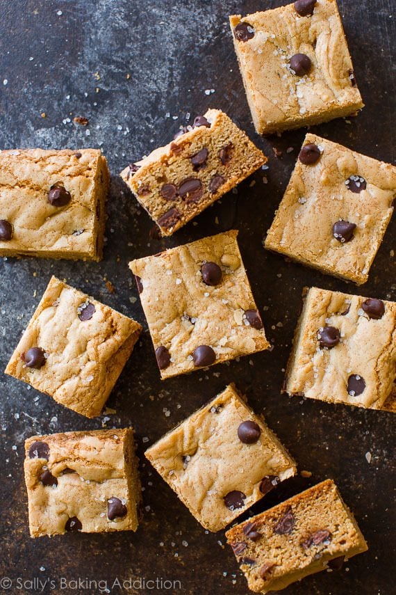 No mixer required and there’s no waiting for cookie dough to chill with these soft & chewy chocolate chip cookie bars!