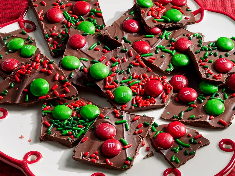 This Christmas bark, with red and green M&Ms and sprinkles, is easy to make—you only need a microwave and refrigerator. The recipe variations, mint chocolate and salted caramel pretzel, offer different choices of color, texture, and flavor, with the flexibility to pick whatever type of chocolate you want.