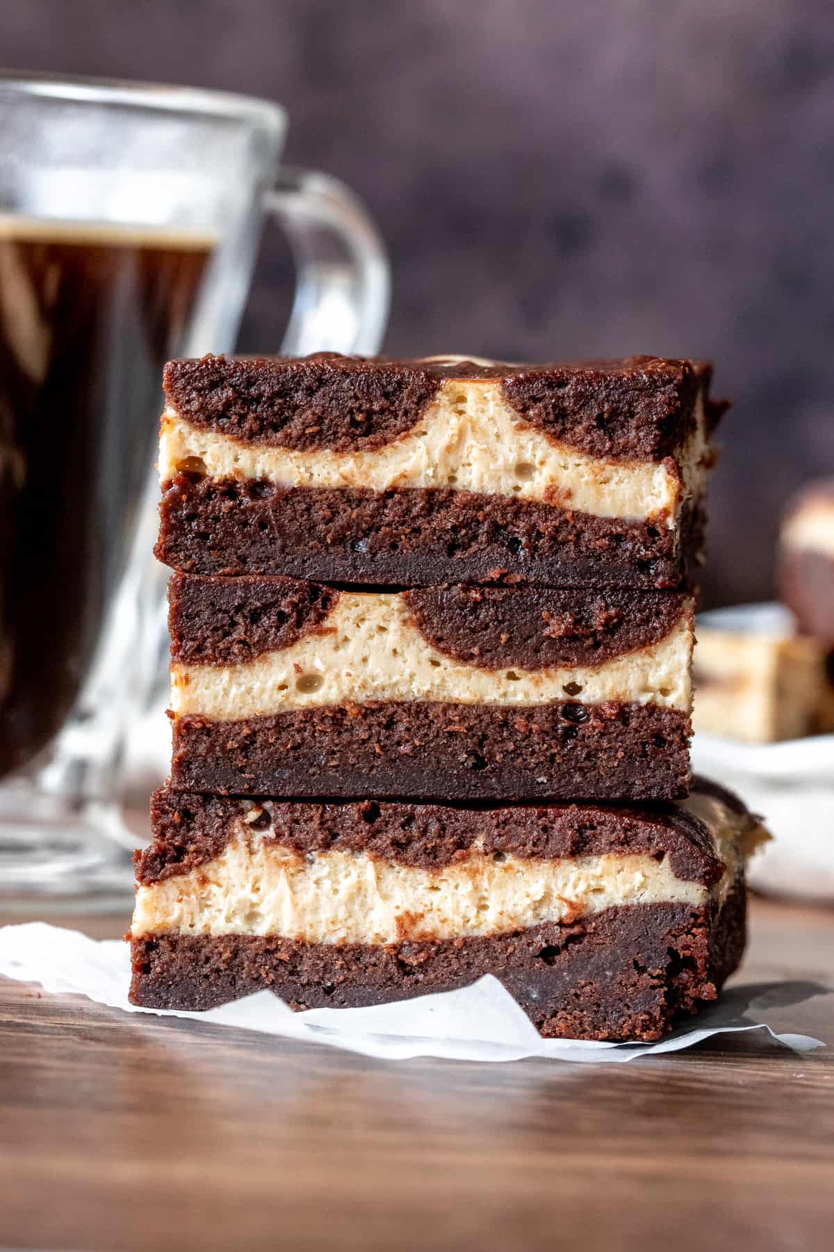 Indulgently rich and fudgy homemade mocha brownies are layered with white chocolate chip-studded cheesecake. They’re moist, rich, and fudgy with coffee flavor and lots of chocolate!