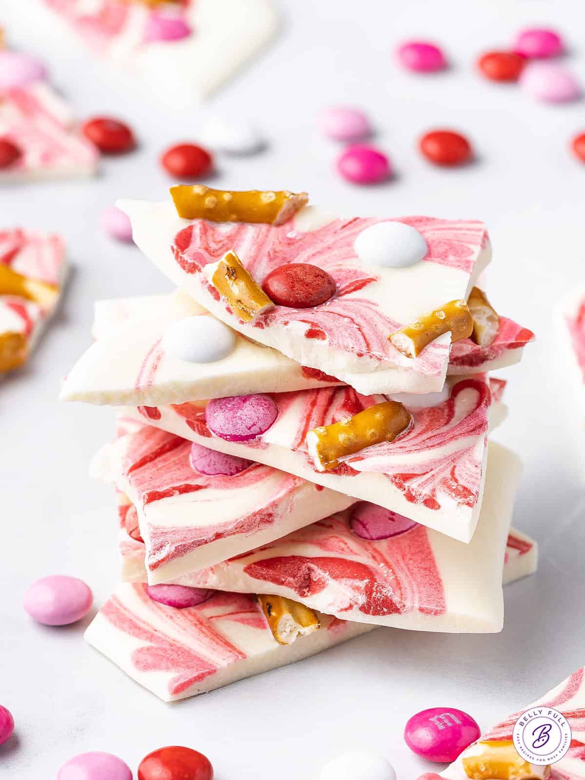 Super simple chocolate bark swirled with pink white chocolate and lots of candy hearts.