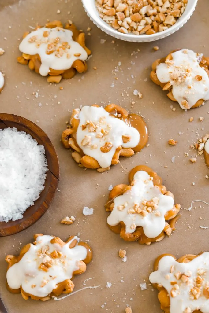 Creamy, chewy, crunchy, and buttery cashew clusters covered in sweet caramel and salted white chocolate.