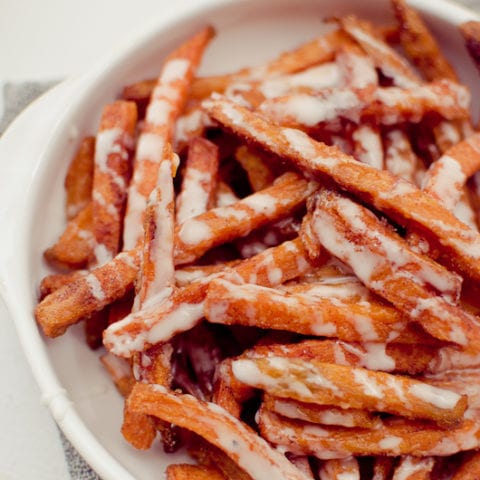 These are crispy baked sweet potato fries coated in cinnamon sugar and served with a sweet vanilla icing. You could even call this a potassium-rich dessert!