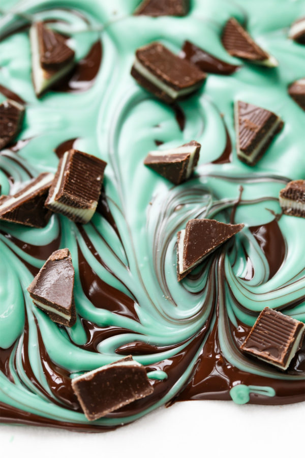 Easy chocolate bark swirled with mint flavored white chocolate.