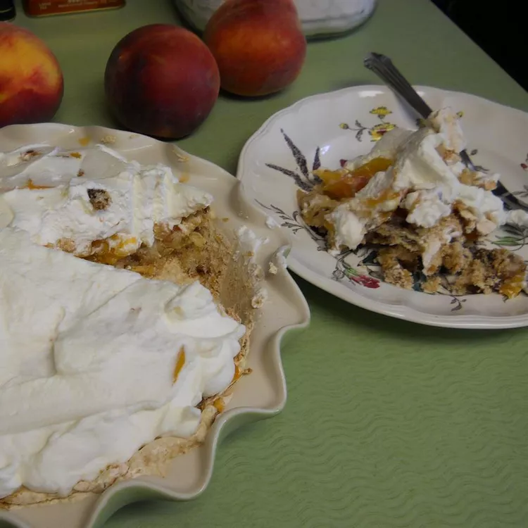 My mom's summer dessert! So easy and fast to make. A vanilla meringue base with pecans is topped with sliced peaches and whipped cream. Make it early in the day; the longer the peaches sit on the crust the better!!!