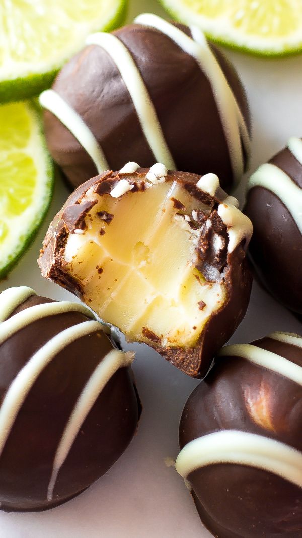 Smooth-as-silk key lime ganache filling enrobed in dark chocolate. These homemade truffles make me weak at the knees!
