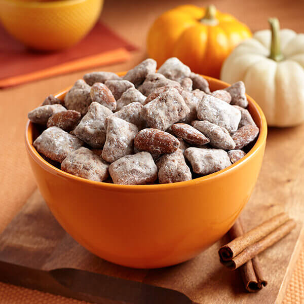 Puppy chow snack mix gets a festive twist with pumpkin spices and candy pumpkins.