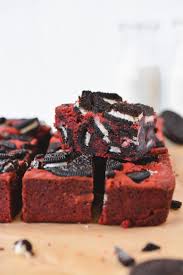 Dense red velvet brownies layered with Oreo frosting, fudgy chocolate ganache, and topped with Oreos.