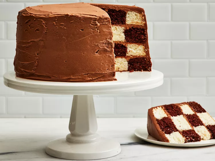 This checkerboard cake consists of tender vanilla and chocolate cakes with a rich, creamy chocolate frosting.