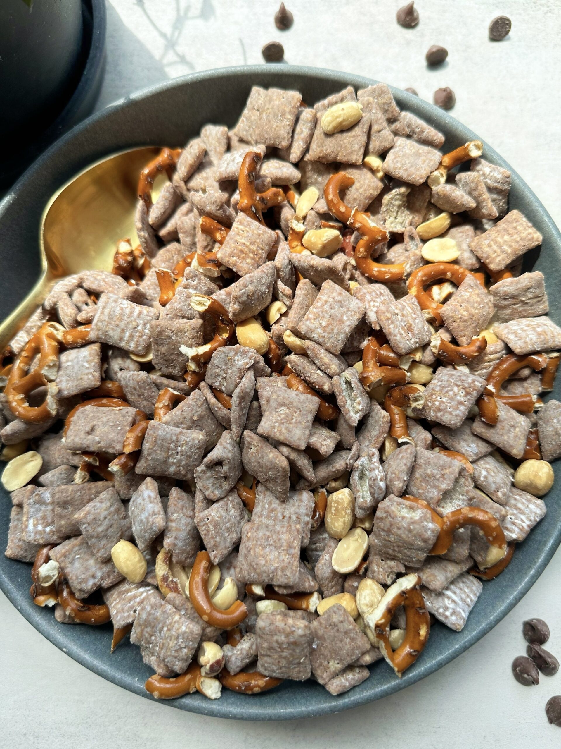 Seriously addicting salty & sweet snack mix made from Nutella, peanuts, and Chex cereal. Recipe is gluten free.