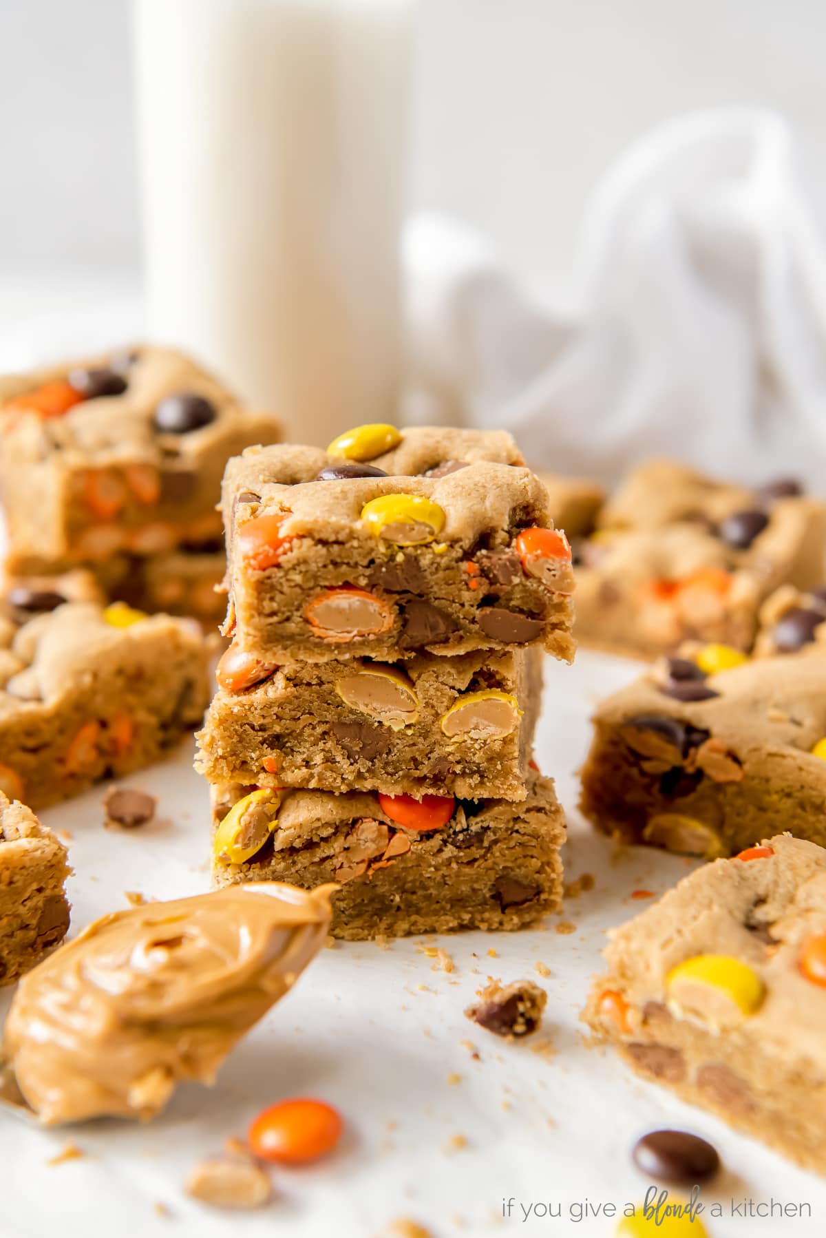 Soft and chewy peanut butter blondies studded with Reese’s Pieces!