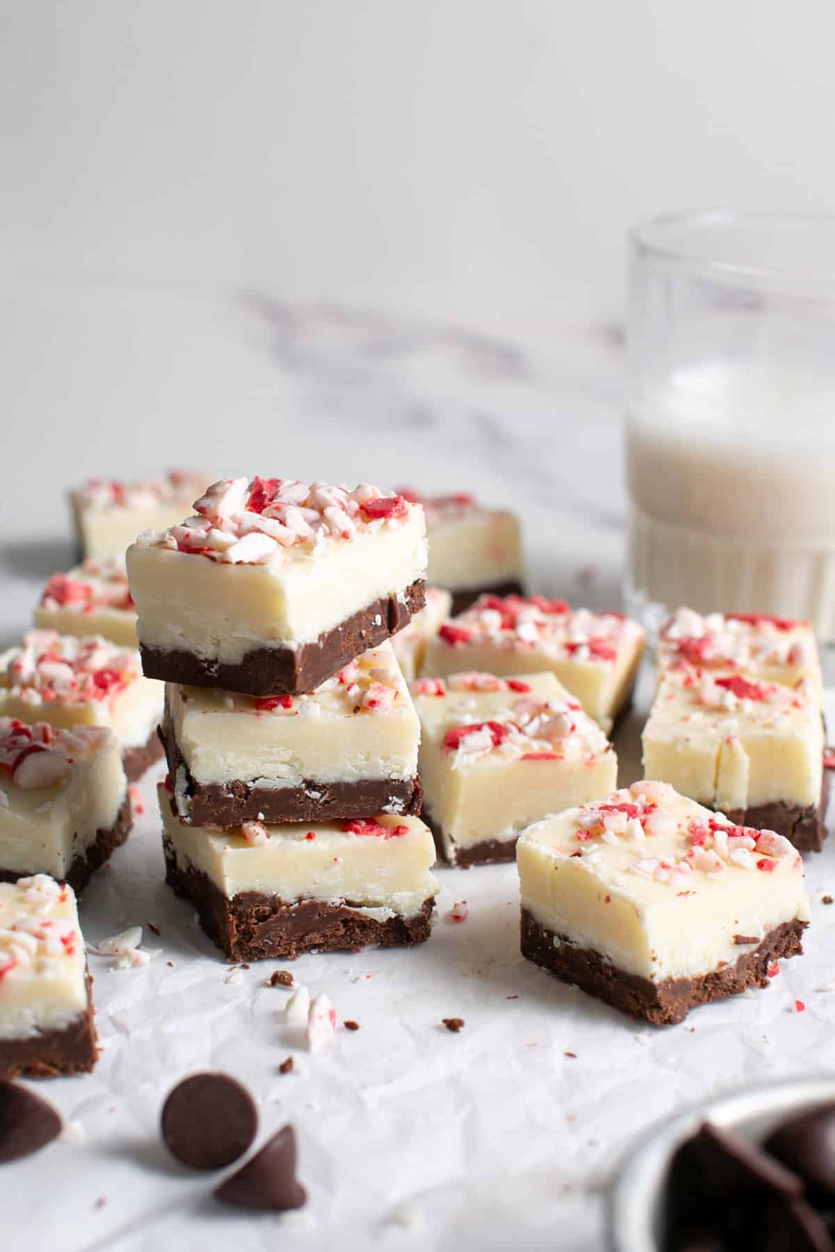 This peppermint bark fudge combines dark chocolate, white chocolate, and peppermint to make a super soft and creamy peppermint bark inspired fudge. By using a shortcut fudge base, we can skip the endless stirring and candy thermometer that traditional fudge recipes require. You only need 7 easy ingredients and, best of all, this fudge freezes beautifully so it’s a perfect make-ahead Christmas treat.