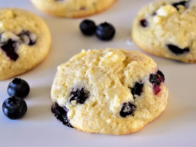 Folding frozen chunks of cream cheese into a sour cream sugar cookie base makes for a wonderfully cheesecakey-flavored cookie! Add in blueberries, and you've got a nice balance of creamy, sweet, salty, and tart berry flavor--all in one deliciously soft cookie!